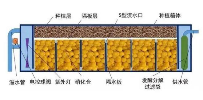 在整个消化种植系统包括种植管、硝化球、发酵分解过滤袋等设备和结构单元构成,实现对于大分子有机物的收集、发酵、分解硝化和植物吸收的作用。